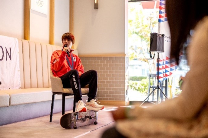 「スケートボードとの出会い」や「オリンピックでの大逆転時の心境」などの経験を子供たちに語るトークショー。